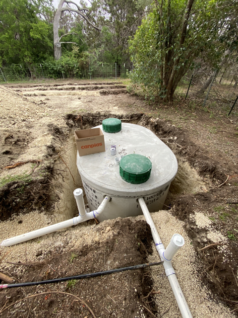The large septic tank holds the wastewater and solids. Bacteria in the tank break down the solids, causing them to decompose before they seep into the leach field.